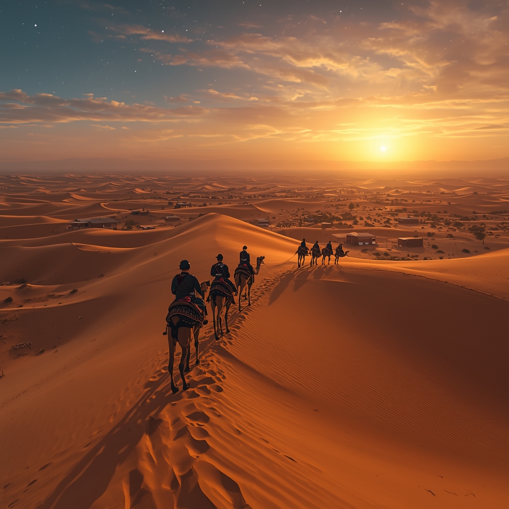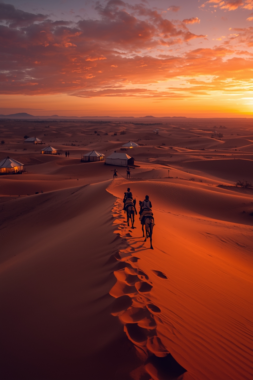 Once in Zagora, we transfer to dromedaries and ride into the desert to reach the sand dunes. Witness a stunning desert sunset, creating unforgettable memories. Spend the night in traditional haimas (desert tents) under the starry desert sky. Dinner is served in the camp.